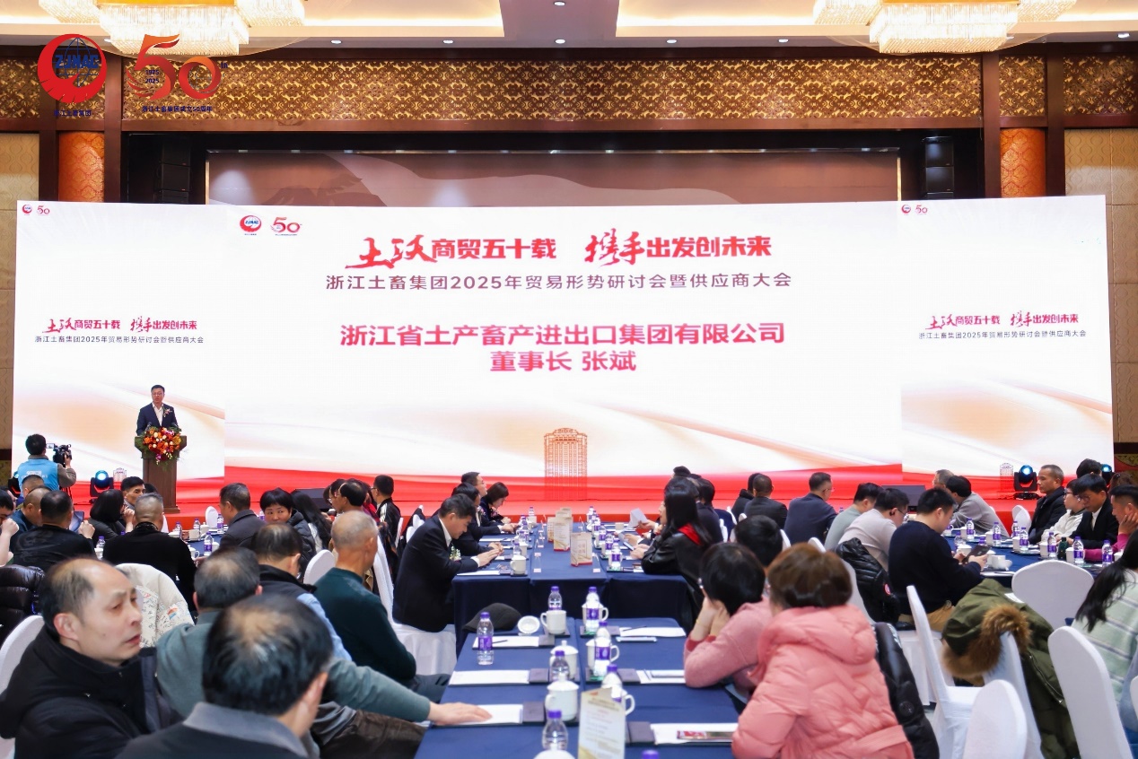 1月8日,浙江土畜在杭州舉辦2025年貿(mào)易形勢研討會暨供應(yīng)商大會,來自全國149家企業(yè)的300余名供應(yīng)商和業(yè)務(wù)員代表們相聚共商未來新發(fā)展。杭州海關(guān)原二級關(guān)務(wù)監(jiān)督、二級巡視員陸海生,省國貿(mào)集團(tuán)黨委委員、副總經(jīng)理張勇,商貿(mào)部相關(guān)負(fù)責(zé)人應(yīng)邀出席,公司領(lǐng)導(dǎo)班子、各部室參加大會。