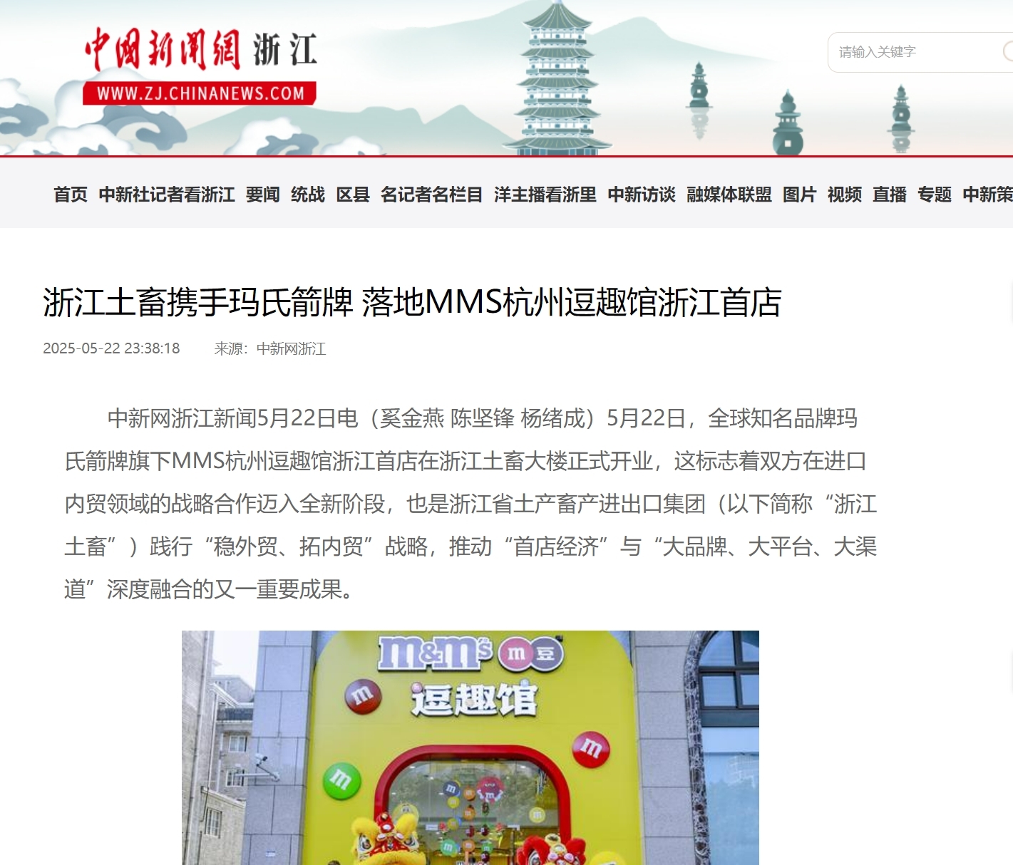 5月22日,全球知名品牌瑪氏箭牌旗下MMS逗趣館浙江首店在浙江土畜大樓正式開業(yè),這標(biāo)志著雙方在進(jìn)口內(nèi)貿(mào)領(lǐng)域的戰(zhàn)略合作邁入全新階段,也是浙江省土產(chǎn)畜產(chǎn)進(jìn)出口集團(tuán)踐行“穩(wěn)外貿(mào)、拓內(nèi)貿(mào)”戰(zhàn)略,推動(dòng)“首店經(jīng)濟(jì)”與“大品牌、大平臺(tái)、大渠道”深度融合的又一重要成果。MMS逗趣館浙江首店落地獲中新社浙江分社、潮新聞、今日長三角等多家媒體關(guān)注報(bào)道。