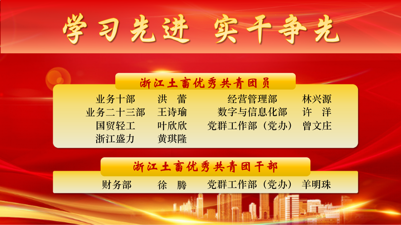 為表彰先進(jìn)、樹(shù)立榜樣,激勵(lì)公司各級(jí)團(tuán)組織和廣大團(tuán)員青年比學(xué)趕超、奮勇?tīng)?zhēng)先,浙江土畜團(tuán)委決定,對(duì)2024年度優(yōu)秀共青團(tuán)員、優(yōu)秀共青團(tuán)干部予以表彰。希望各級(jí)團(tuán)組織和團(tuán)員青年,要以受表彰的先進(jìn)典型為榜樣,學(xué)習(xí)他們對(duì)黨忠誠(chéng)、積極向上的政治本色,學(xué)習(xí)他們敢挑重?fù)?dān)、沖鋒在前的硬核擔(dān)當(dāng),學(xué)習(xí)他們立足一線、創(chuàng)先爭(zhēng)優(yōu)的務(wù)實(shí)作風(fēng),學(xué)習(xí)他們遵規(guī)守紀(jì)、積極作為的職業(yè)操守。要大力傳承和發(fā)揚(yáng)土畜人“實(shí)干”的優(yōu)良傳統(tǒng),在深度融入共同富裕、開(kāi)放強(qiáng)省等重大戰(zhàn)略中加快打造“國(guó)際供應(yīng)鏈服務(wù)價(jià)值創(chuàng)造者”,貢獻(xiàn)更多青春力量。