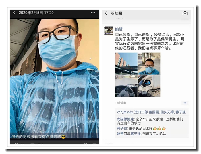 為了確保與公司長(zhǎng)期合作的大型超市冷凍肉類貨源供應(yīng)充足,維護(hù)市場(chǎng)肉類產(chǎn)品的價(jià)格穩(wěn)定,省土畜進(jìn)口二部副經(jīng)理姚赟面對(duì)冷庫基地限時(shí)開放、外包運(yùn)輸受限無法上路的不利局面,與同事承擔(dān)起了緊急配送的民生保障任務(wù)。整整兩車共計(jì)10噸凍肉的裝卸配送后,汗水、熱氣讓姚赟的外套和防護(hù)雨披黏在了一起,輕貓淡寫的一句“濕透的羽絨服看去有點(diǎn)肌肉感!”背后隱含的是土畜人為合作客戶和消費(fèi)者極限服務(wù)的責(zé)任心。