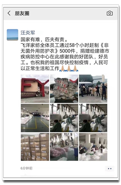 除了給我們加油鼓氣的韓國供貨商,業(yè)務(wù)十一部的國內(nèi)生產(chǎn)企業(yè)同樣讓人肅然起敬。建德飛洋家紡?fù)粞总娍偨?jīng)理在春節(jié)假期還未結(jié)束的時候,就緊急召回所有本地員工,在58小時內(nèi)趕制出5000件“非無菌外用防護衣”捐贈給建德市疾病防控中心。無論是飛洋家紡充滿社會責任感的慷慨老板,還是不計報酬、不辭辛苦的普通工人,無不讓人動容感懷,一句“國家有難,匹夫有責?!辈唤屓虽粶I下。