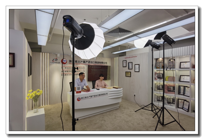 浙江土畜公司層面分布制定、實施籌備方案,上傳4000余條格式統一的產品圖片、視頻等信息資料,建立15個參展展區(qū)的虛擬展位,通過云展廳多維度展現公司拳頭產品、品牌展位形象的基礎上,高標準搭建企業(yè)直播間,新建公司形象和產品展示兩個直播間,根據產品劃分直播區(qū)域,最大程度利用直播空間。網絡直播對于傳統外貿企業(yè)由線下轉到線上營銷的重要窗口,浙江土畜在展前多次組織業(yè)務員主播參加線上和線下直播培訓,提升直播技能、加強知識產權保護意識。