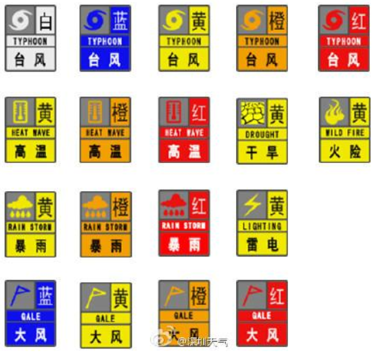 32.氣象災(zāi)害預(yù)警信號(hào):浙江省氣象災(zāi)害預(yù)警信號(hào)分臺(tái)風(fēng)、大風(fēng)、暴雨、暴雪、寒潮、低溫、霜凍、道路結(jié)冰、冰雹、高溫、干旱、雷電、大霧、霾14類。根據(jù)氣象災(zāi)害可能造成的危害程度、發(fā)生的緊急程度以及發(fā)展態(tài)勢(shì),氣象災(zāi)害預(yù)警信號(hào)一般劃分為四級(jí):Ⅳ級(jí)(一般)、Ⅲ級(jí)(較重)、Ⅱ級(jí)(嚴(yán)重)、Ⅰ級(jí)(特別嚴(yán)重),分別用藍(lán)色、黃色、橙色、紅色中英文圖標(biāo)標(biāo)識(shí)。