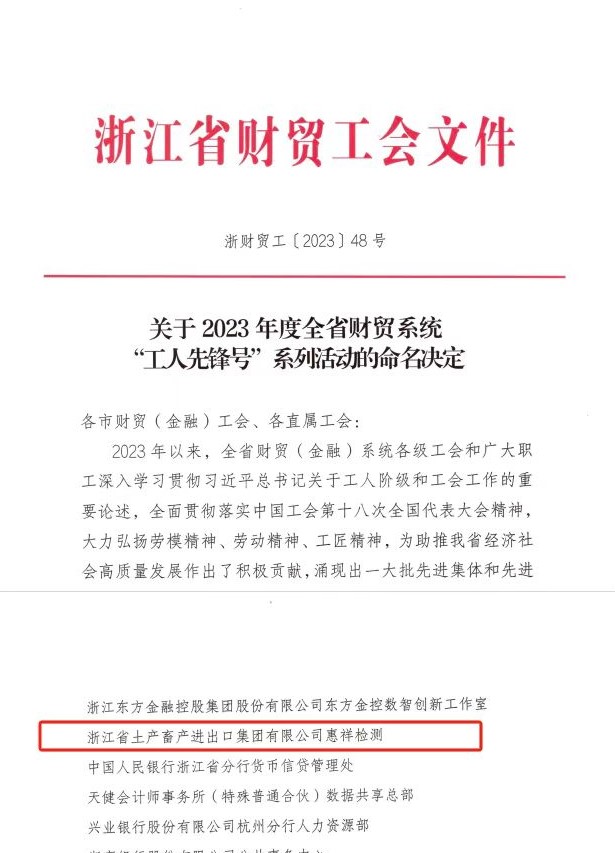 近日,浙江土畜惠祥檢測(cè)班組以其專業(yè)、優(yōu)質(zhì)、高效的檢測(cè)服務(wù),創(chuàng)新、務(wù)實(shí)、奮斗的團(tuán)隊(duì)精神,榮獲2023年度浙江省財(cái)貿(mào)工會(huì)“工人先鋒號(hào)”稱號(hào)。