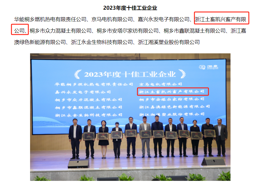 喜報(bào)!浙江土畜凱興畜產(chǎn)有限公司喜獲洲泉鎮(zhèn)2023年度“十佳工業(yè)企業(yè)”和“優(yōu)秀農(nóng)業(yè)龍頭企業(yè)”雙榮譽(yù)
