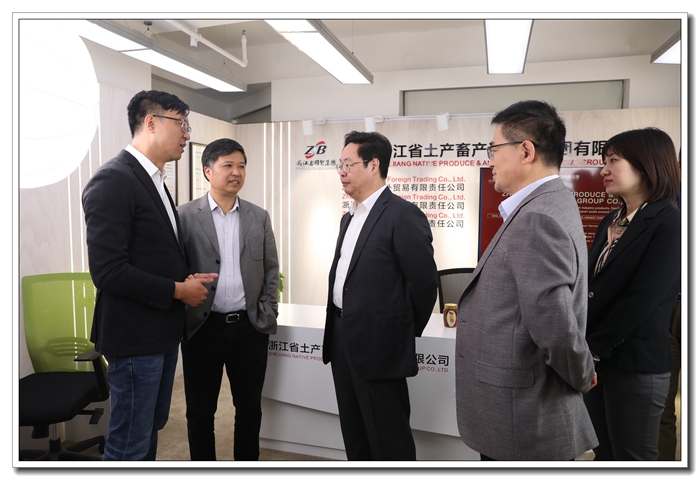 10月20日,浙江省商務(wù)廳黨組副書記、副廳長、一級(jí)巡視員韓杰蒞臨省土畜,走訪調(diào)研今年公司經(jīng)營情況、第128屆網(wǎng)上廣交會(huì)參展情況,省國貿(mào)集團(tuán)黨委委員、副總經(jīng)理黃道領(lǐng)陪同調(diào)研。省商務(wù)廳對(duì)外貿(mào)易發(fā)展處副處長胡興遠(yuǎn),省土畜董事長張斌、總經(jīng)理?xiàng)钴S勝參加。