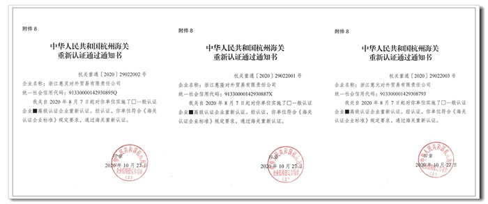 日前,公司下屬浙江惠元對外貿(mào)易有限責任公司、浙江惠靈對外貿(mào)易有限責任公司、浙江惠隆對外貿(mào)易有限責任公司收到了杭州海關(guān)簽發(fā)的《重新認證通過通知書》,成為今年杭州關(guān)區(qū)首批通過AEO高級認證重新認證的企業(yè)。