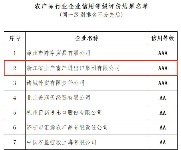 近日,中國食品土畜進出口商會公布了農(nóng)產(chǎn)品行業(yè)企業(yè)信用等級評價結(jié)果,浙江土畜成為全國眾多參展企業(yè)中,3家最高AAA信用等級的企業(yè)之一。